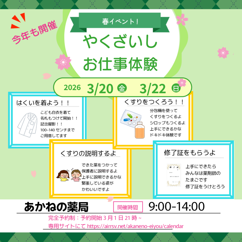 毎年恒例、こども調剤体験が決まりました。